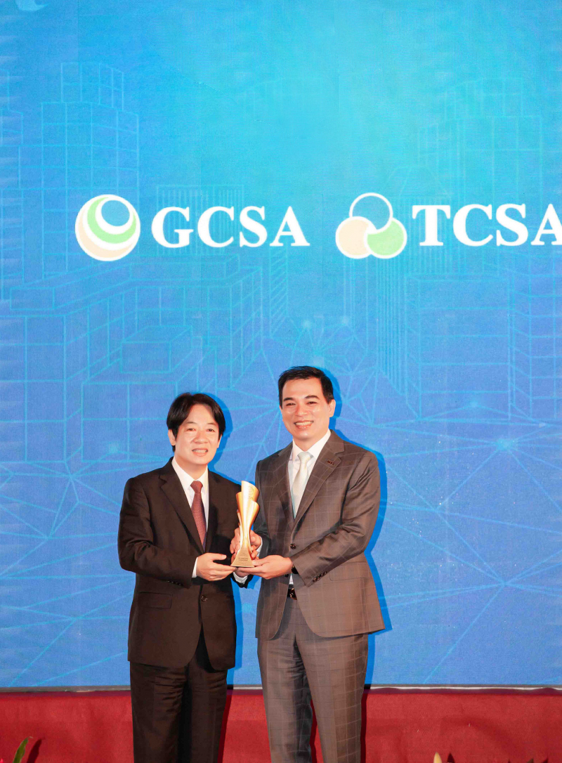 达全方位永续表现获全球永续奖及台湾永续奖肯定,由副总统赖清德颁奖 (左),hth·华体总经理柯富仁 (右) 代表领奖