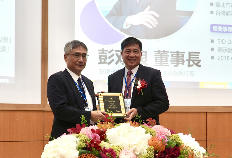 友達董事長彭双浪獲頒「工業工程獎章-產業貢獻獎」,由中國工業工程學會理事長楊能舒 (左) 頒獎 |