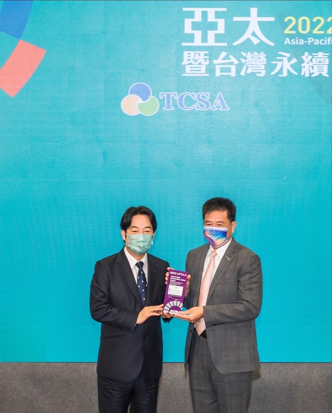 友達以卓越永續績效表現,在第一屆亞太永續行動獎獲得肯定,由副總統賴清德頒獎(左),友達光電董事長暨執行長彭双浪(右)代表領獎